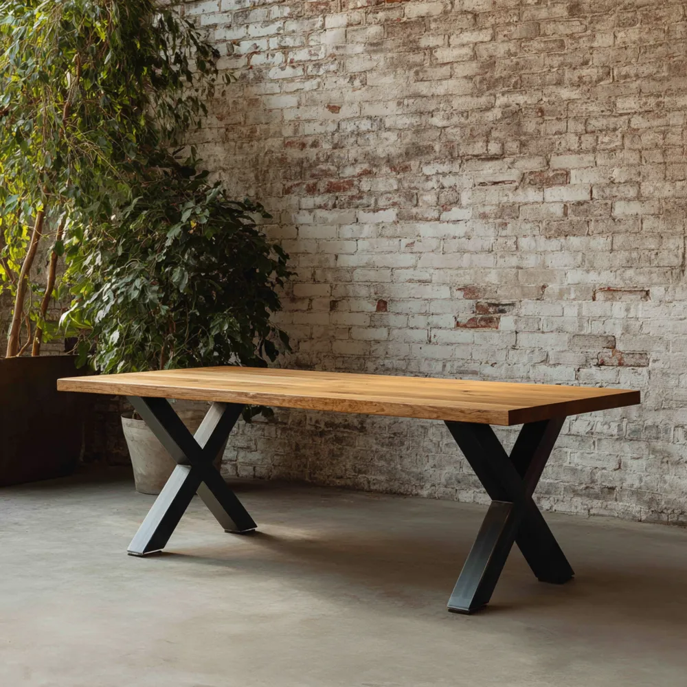 Material und VerarbeitungDer Tisch besteht aus hochwertigem Massivholz in einem natürlichen Finish und wird von einem stabilen Metallgestell in Schwarz getragen.