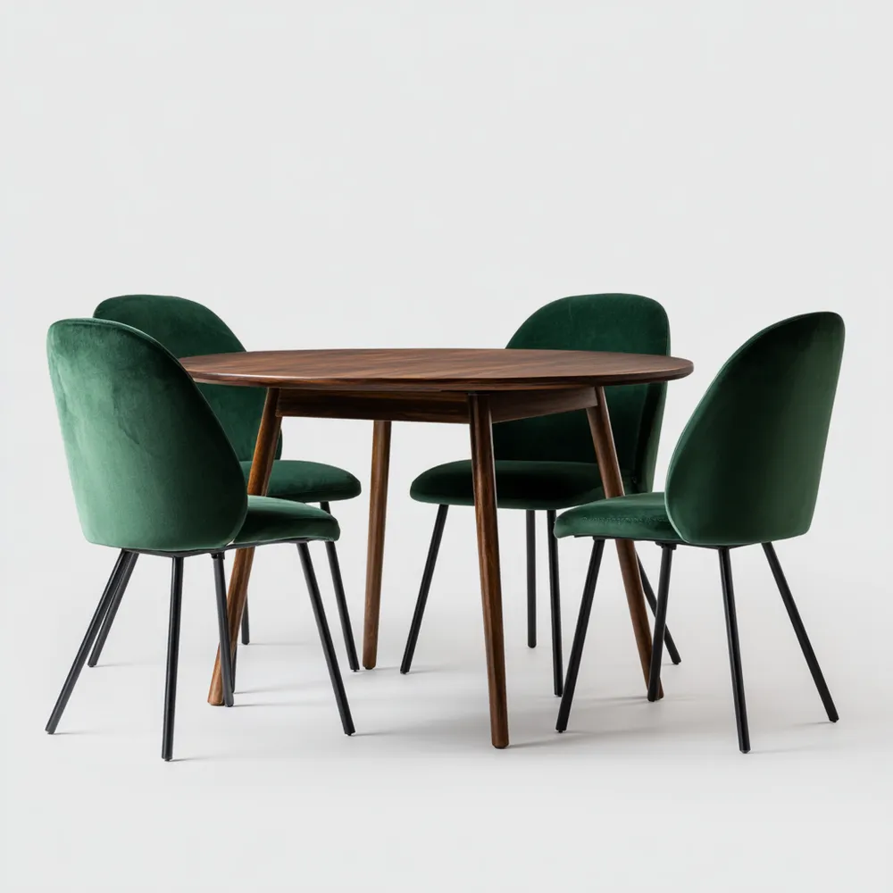 Material und VerarbeitungDer Tisch ist aus robustem Holz gefertigt, während die Stühle mit hochwertigem, Dunkelgrünem Stoff bezogen sind. Die Stuhlbeine sind aus stabilem Metall.