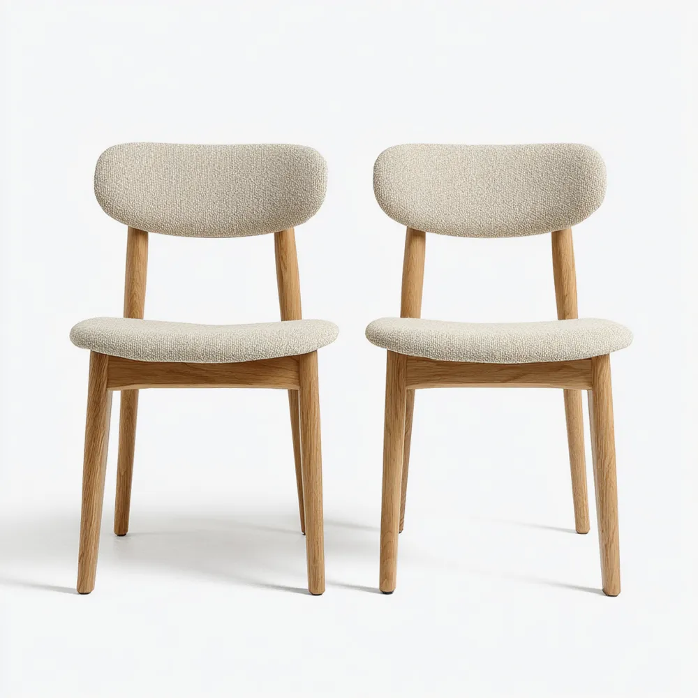 Material und VerarbeitungDie Stühle sind aus hochwertigem Holz gefertigt und mit einem weichen, Beigefarbenem Stoff bezogen. Die Materialien bieten eine langlebige Nutzung und einen hohen Sitzkomfort.