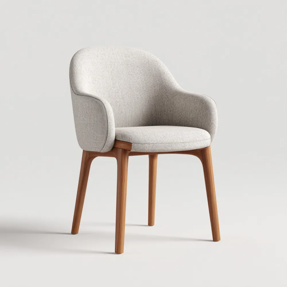 Material und VerarbeitungDer Stuhl ist mit hochwertigem Stoff in Hellgrau gepolstert. Die Beine bestehen aus robustem Holz, das für Stabilität und Langlebigkeit sorgt.