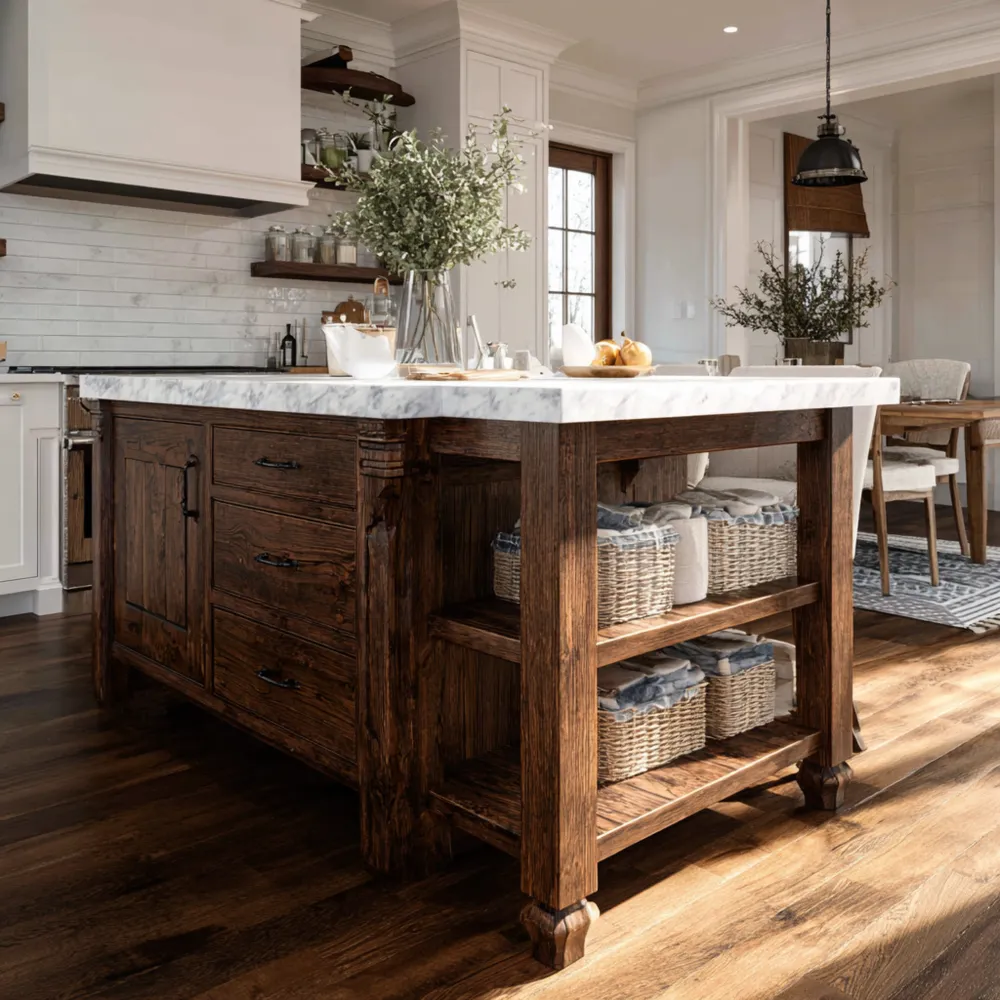 ProduktübersichtDiese Kücheninsel vereint Funktionalität und rustikalen Charme und ist die perfekte Ergänzung für jede moderne Küche. Die Kombination aus hochwertigem Massivholz und einer eleganten Marmorplatte sorgt für Langlebigkeit und ein ansprechendes Design.